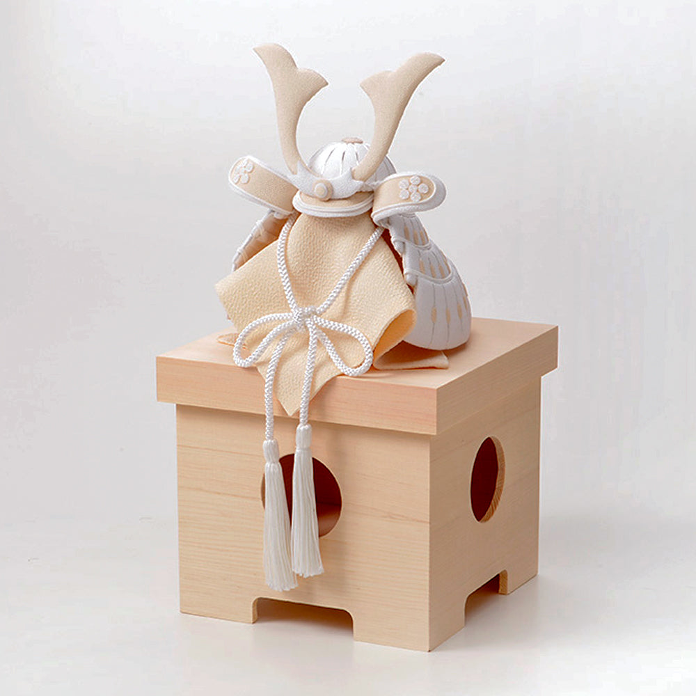 インテリアにも馴染みやすい、白とベージュのちりめん兜飾りです。